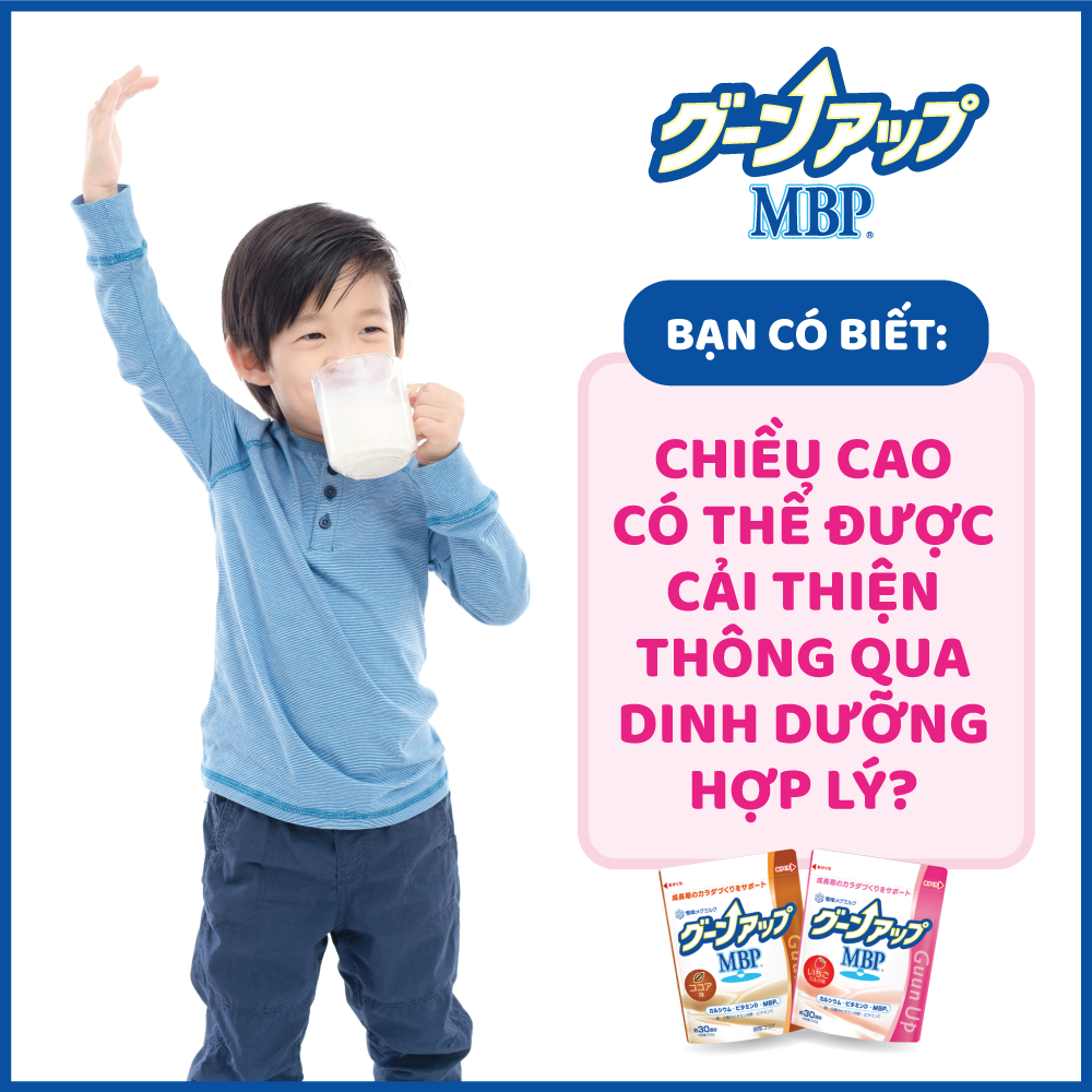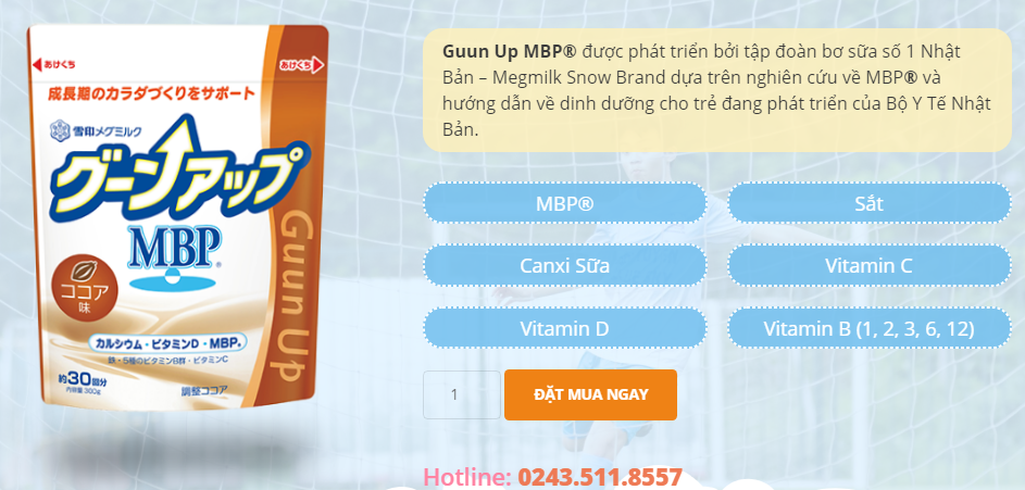 Guun Up MBP là thực phẩm bổ sung đến từ Nhật Bản, có công thức ưu việt của MBP®, Canxi hữu cơ từ sữa, Vitamin D, sắt và các vitamin khoáng chất cần thiết hỗ trợ tối ưu cho trẻ phát triển cơ thể, tăng mật độ xương và giúp xương chắc khỏe.